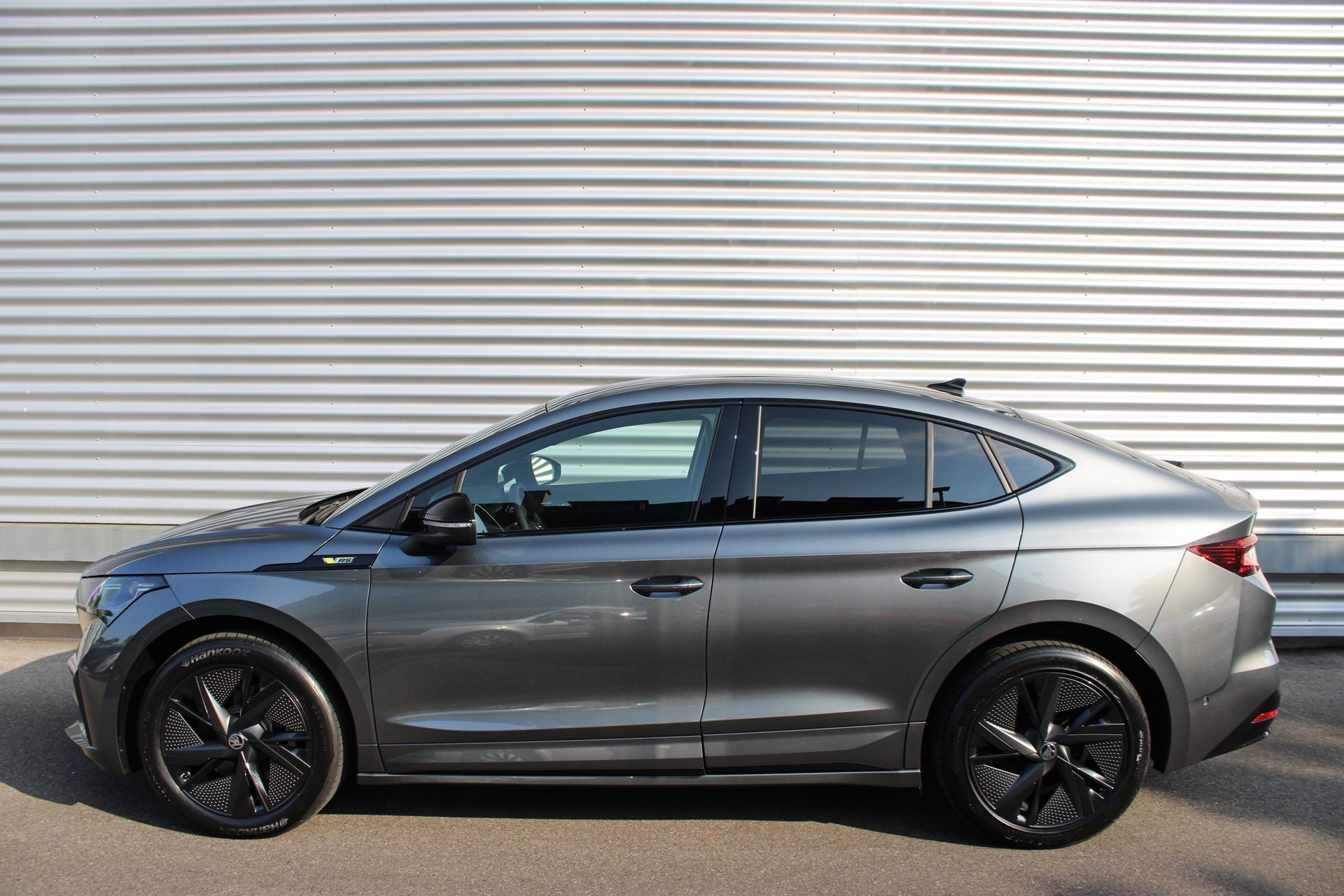 Met een lengte van 4 meter 65, een breedte van 1 meter 88 en een hoogte van 1 meter 62 scheelt hij niks in verhouding tot de ENYAQ iV. Achterin wordt hierdoor íets aan hoofdruimte ingeleverd, maar de coupé-SUV wordt er óók een stukje aerodynamischer door. Het bericht gaat verder onder de afbeelding. Zijn uiterlijk heeft een upgrade gekregen: hij heeft een verlaagd onderstel, een afwijkende grille-omlijsting en diffuser, zwarte afwerkingsaccenten en grote lichtmetalen velgen.